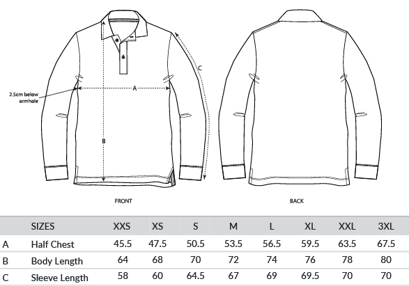 Set-in sleeve. Flat knit rib on the collar. Inside heavy single Jersey back neck tape. Front placket with two buttons in matching body colour. Slit at side seams with heavy single Jersey facing. Single-needle topstitch at shoulder seams. 1x1 rib at sleeve hem. Bottom hem with a narrow double-needle topstitch.